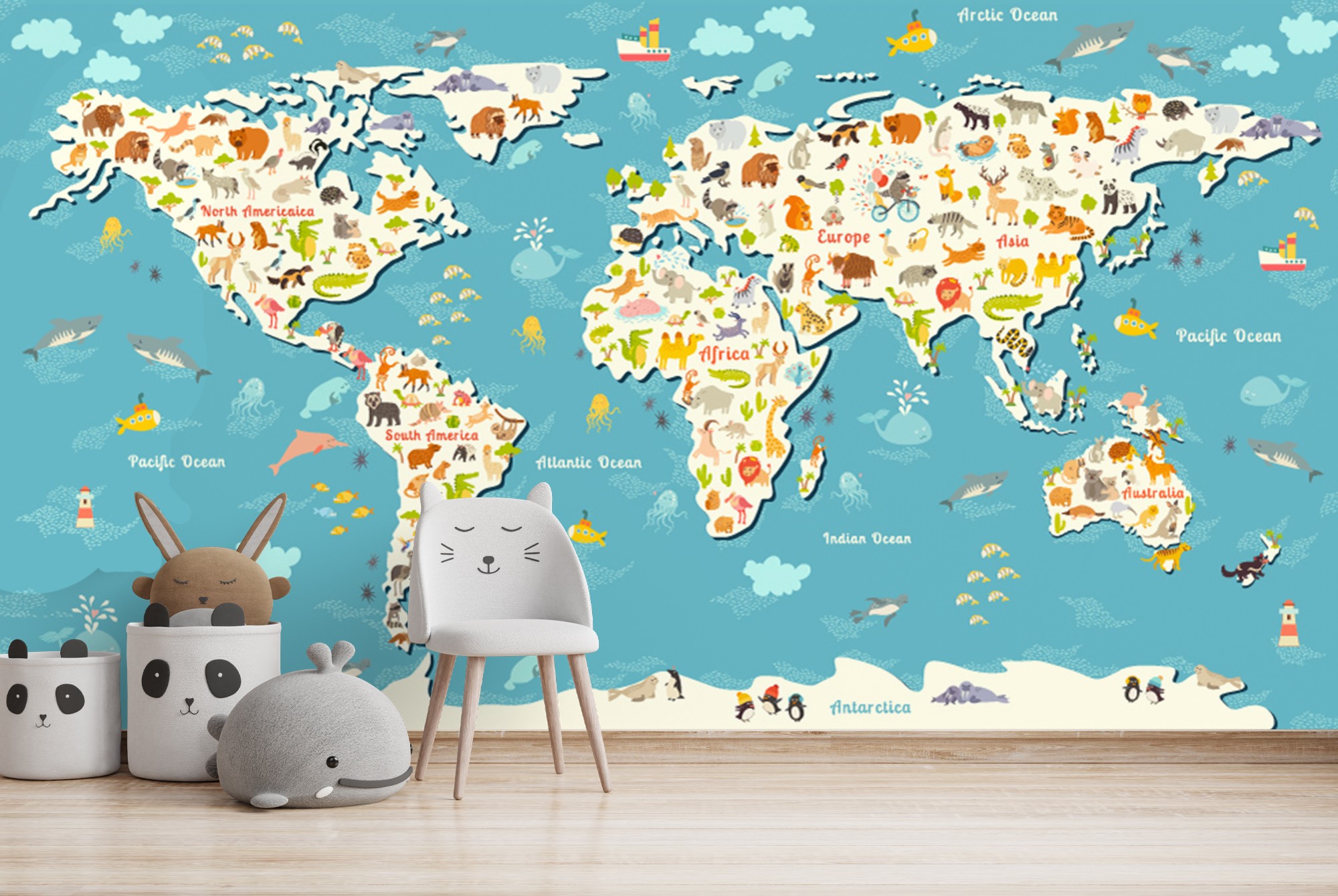 Cartoon Animal World Map Wallpaper Children Room Boys And ...